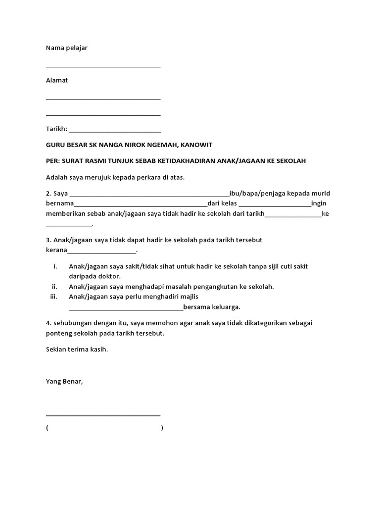 Contoh Surat Rasmi Tidak Hadir Ke Sekolah Yang Ringkas Letter 7saudara Com